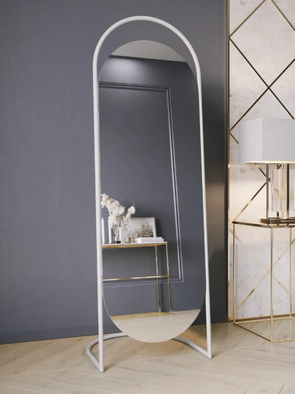 Зеркало «Queen». Артикул GMZ-01-1/2/3 Дизайнерское напольное зеркало в полный рост в металлической овальной раме ручной работы выполнено в минималистичном стиле. Простая изысканность форм и современный дизайн делает его уместным практически в любом интерьере. Оно может быть установлено в спальне, прихожей, гостиной, где за счёт своих внушительных размеров способно расширить пространство и создать иллюзию источника освещения. Зеркальное полотно изготовлено известным бельгийским производителем AGC и воплощает в себе старинные европейские традиции в совокупности с новейшими технологиями изготовления стекла. Наклон зеркала оптимальный фиксированный, что позволяет отражать любой рост.Характеристики:– профиль рамы – труба, диаметром 20 мм; – габариты – 1650х540х400 мм; – размер зеркального полотна – 1350х500 мм, толщина – 4 мм; – вес – 11 кг; – устойчивая двухслойная порошковая окраска; – возможные цвета – золотой, чёрный, белый.